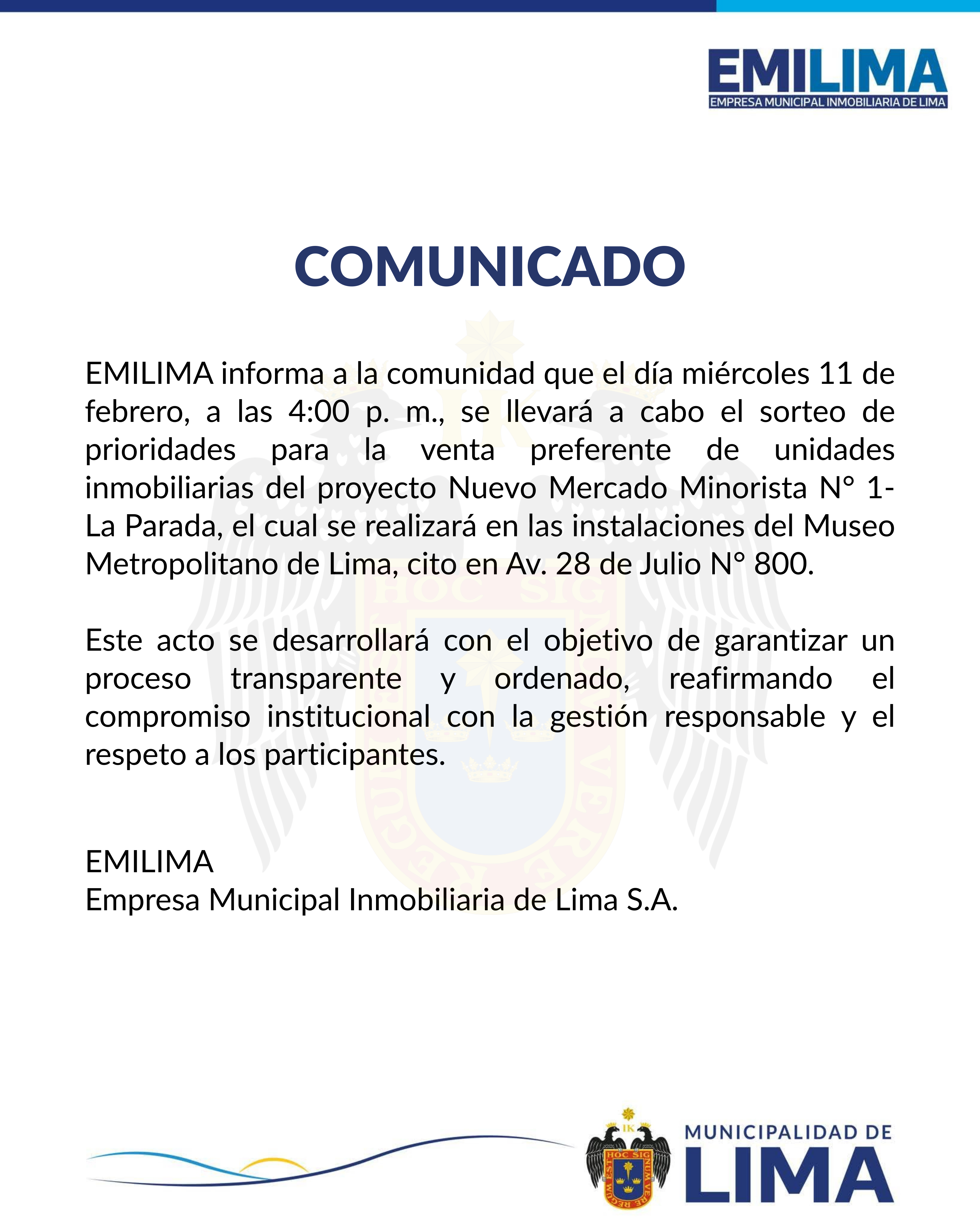 EMILIMA S.A. es una empresa de propiedad de la Municipalidad Metropolitana de Lima, con personalidad jurídica de derecho privado, creada mediante Acuerdo de Concejo N° 106, de fecha 22 de mayo de 1986, e inscrita en la Partida Electrónica Nº 00824828 del Registro de Personas Jurídicas de la Zona Registral N° IX -Sede Lima. Ha sido constituida bajo la forma de sociedad anónima y se rige por sus estatutos sociales, la Ley General de Sociedades y otras normas que la comprenden.