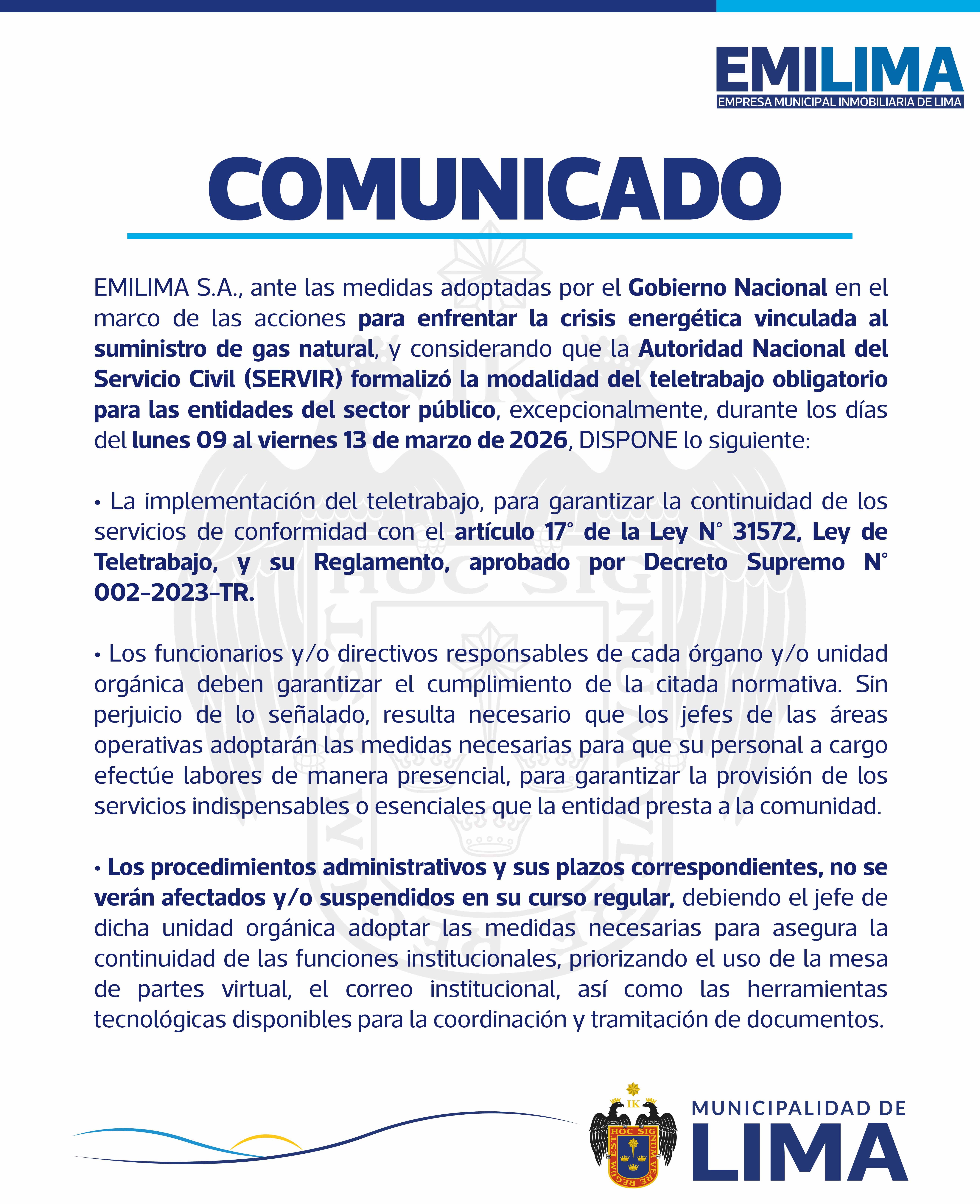 EMILIMA S.A. es una empresa de propiedad de la Municipalidad Metropolitana de Lima, con personalidad jurídica de derecho privado, creada mediante Acuerdo de Concejo N° 106, de fecha 22 de mayo de 1986, e inscrita en la Partida Electrónica Nº 00824828 del Registro de Personas Jurídicas de la Zona Registral N° IX -Sede Lima. Ha sido constituida bajo la forma de sociedad anónima y se rige por sus estatutos sociales, la Ley General de Sociedades y otras normas que la comprenden.